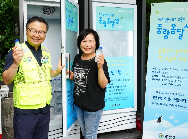야외 생수 냉장고 ‘중랑옹달샘’은 지난 7월 15일부터 공원과 중랑천 제방 등 9개소에 설치되어 야외활동 중인 주민들에게 시원한 생수를 제공하여 온열 질환 및 탈수를 예방하는 데 도움을 주고 있다. 주민들로부터 높은 이용 만족도를 얻고 있으며, 폭염 속 쉼터 역할을 톡톡히 하고 있다. 아울러 망우로, 용마폭포공원, 중화수경공원, 중랑천 둔치 등에는 쿨링포그(안개형 냉각수 분사장치)를 설치해 시원한 물안개를 공급함으로써 도심의 불쾌지수를 낮추고 있다.