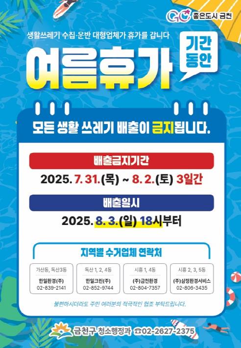 주민들은 청소대행업체의 환경미화원 휴가 기간 이후인 8월 3일 저녁 6시부터 생활쓰레기를 배출할 수 있다.