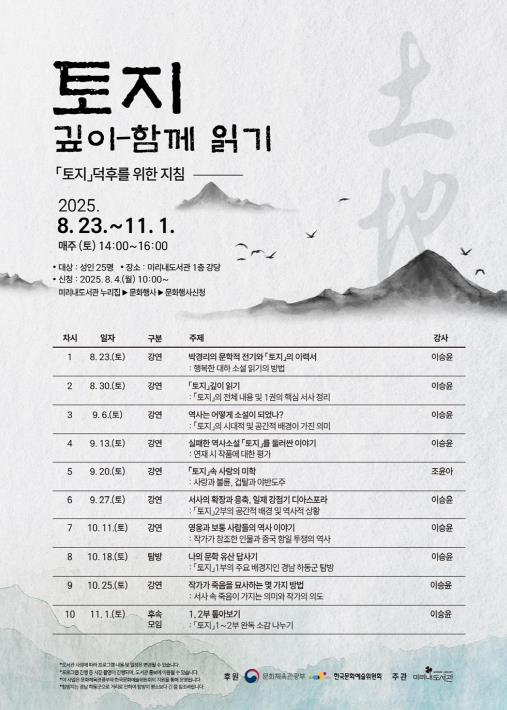 이번 프로그램에서는 소설 토지의 1부와 2부를 함께 읽으며 전체 서사와 공간, 인물 등 세부 주제에 대해 깊이 있게 이해하는 시간을 가질 예정이다. 소설 배경인 경상남도 하동군 탐방, 토지 완독 소감을 나누는 후속 모임 등을 포함해 총 10회차에 걸쳐 진행된다.