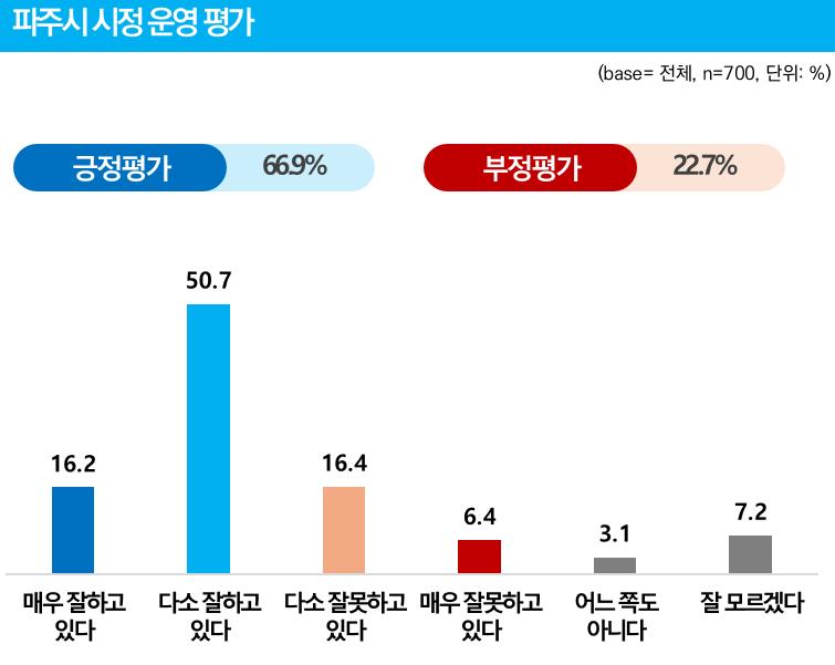 파주시가 의뢰하고 여론조사기관 ㈜글로벌리서치에서 수행한 조사 결과에 따르면 파주시정에 대한 긍정 평가가 66.9%(매우 잘하고 있다 16.2%, 다소 잘하고 있다 50.7%)로, 부정 평가 22.7%보다 월등히 높은 것으로 나타났다. 이번 조사는 지난 6월 30일부터 7월 2일까지 3일간 파주시에 거주하는 18세 이상 남녀 700명을 대상으로 실시됐으며, 표본 오차는 95%, 신뢰수준은 ۭ.7% p이다.