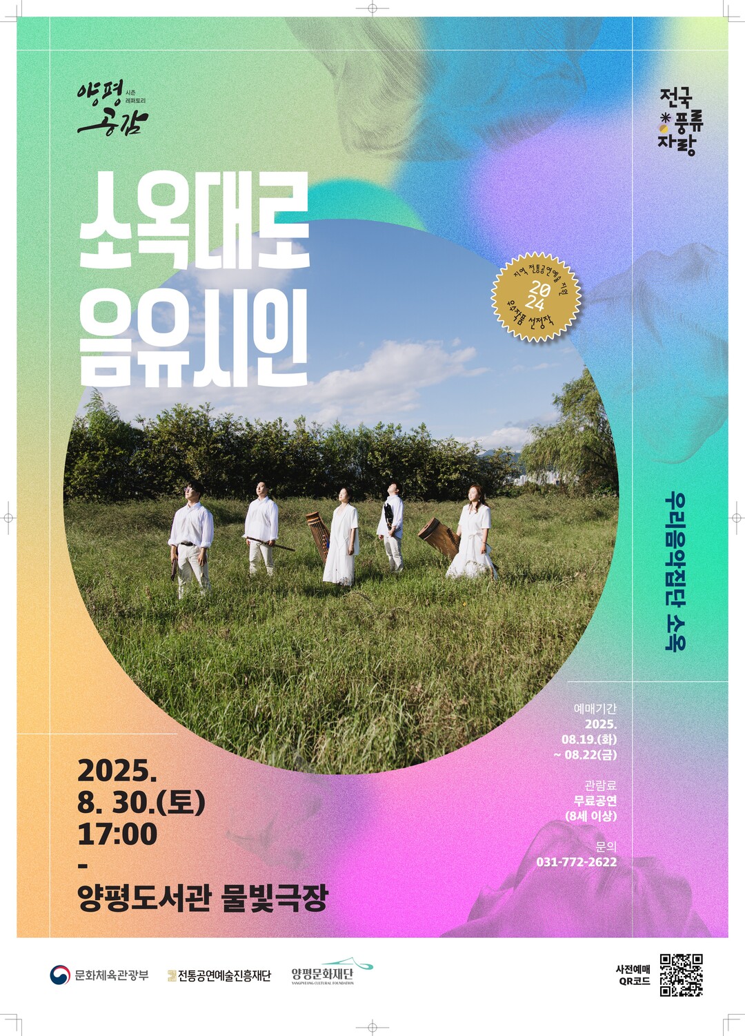 8월 30일 양평도서관 물빛극장에서 열리는 이번 공연은 문화체육관광부 후원, 전통공연예술진흥재단과 양평문화재단 공동 주관의‘지역 전통 공연예술 지원사업’에 선정된 우수 공연으로, 지역 관객에게 수준 높은 창작국악의 진면목을 선사할 예정이다.
