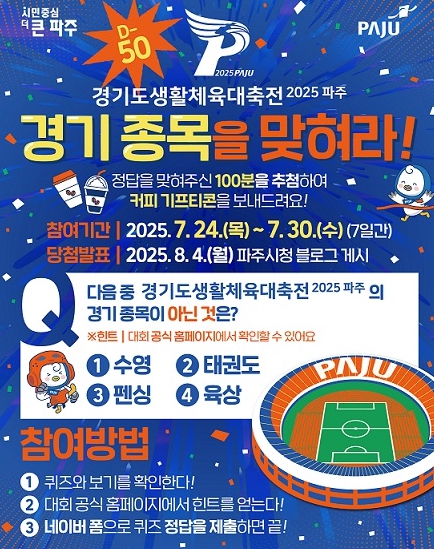 이번 행사는 대회 개막 50일 전을 기념해 마련된 것으로, 시민들이 생활체육 종목에 대한 흥미를 가지고 대회에 자연스럽게 관심을 가질 수 있도록 기획됐다. ‘경기 종목 맞히기 퀴즈’는 파주시청 블로그를 통해 참여할 수 있으며, 4지선다형 문제로 출제된다. 정답자 중 100명을 추첨해 모바일 커피 상품권을 증정할 예정이다.