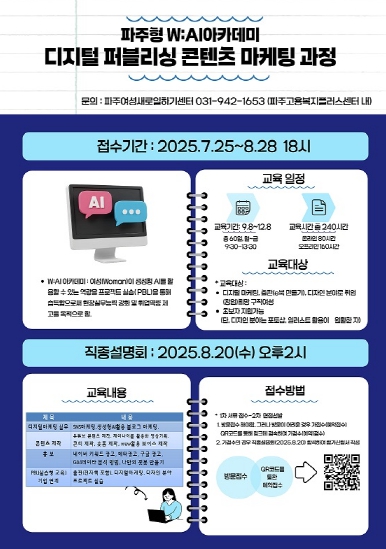 파주 출판단지를 비롯한 지역 산업 수요에 부합하는 실무형 인재 양성을 위한 ‘파주형 더블유(W): 인공지능(AI)아카데미-디지털 퍼블리싱 콘텐츠 마케팅 과정’은 오는 9월 8일부터 12월 8일까지(총 240시간) 운영되며, ▲디지털마케팅 ▲출판(이(e)북 만들기) ▲디자인 분야로 취업을 희망하는 여성 구직자 20명을 대상으로 한다.