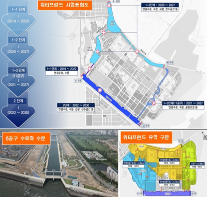 워터프런트 1-1단계는 1·3공구와 6·8공구 유수지 및 남측바다를 연결하는 수로와 수문 설치로 2022년 완료됐다.