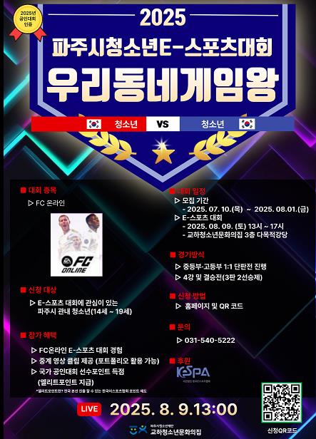 참가 대상은 파주시 관내 14세에서 19세 청소년으로, 축구 게임 ‘피파온라인’을 좋아하는 청소년 누구나 지원할 수 있다. 대회 참가자들에게는 대회 참가 경험뿐만 아니라 이(e)-스포츠 중계 편집 영상을 제공받아 향후 실적 자료집(포트폴리오)로도 활용할 수 있다.