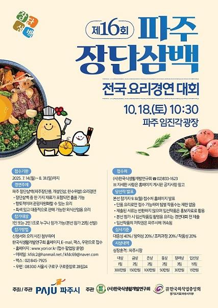 자세한 내용은 파주시청 누리집 새소식 게시판에 ‘제16회 파주 장단삼백 전국요리경연대회’를 검색해 확인할 수 있으며, 문의는 (사)한국식생활개발연구회로 하면 된다.