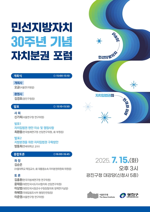 이번 1차 포럼에서는 지난 30년간 자치입법권의 현황과 제도적 쟁점을 점검하고, 실질적 자치분권 국가로 나아가기 위한 제도 개선 방향을 모색할 예정이다.