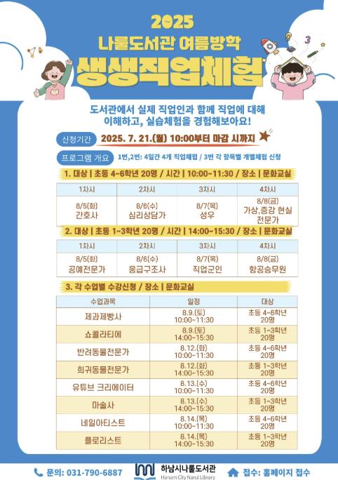 개별 체험 수업은 8월 9일부터 14일까지 열린다. 초등 4~6학년은 오전 10시부터 11시 30분까지 제과제빵사(9일), 반려동물전문가(12일), 유튜브 크리에이터(13일), 네일아티스트(14일) 체험을 할 수 있다. 초등 1~3학년은 오후 2시부터 3시 30분까지 쇼콜라티에(9일), 희귀동물전문가(12일), 마술사(13일), 플로리스트(14일) 체험으로 구성된다. 모든 수업은 정원 20명으로 운영된다.