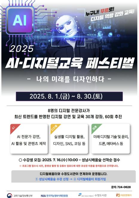 AI, 코딩, 영상 제작, 메타버스, 디지털 범죄, 드론 등 다양한 분야의 전문 강사 8명이 강연 및 교육 등 총 30개 강좌를 60회에 걸쳐 운영하며, 이론과 실습이 결합된 체험 중심 교육을 통해 시민의 실생활 속 디지털 전환을 적극 지원할 계획이다.