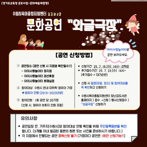 ‘와글극장’은 미취학 영유아 가족 20가정을 대상으로 아이사랑놀이터 정자점, 권선휴점, 호매실점에서 각각 공연을 진행한다. 회당 약 50명 규모로 총 3회 운영된다.