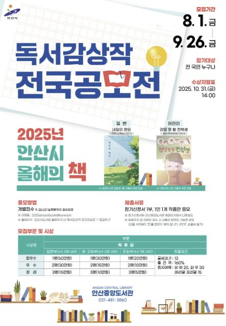 우선, 다음 달 1일부터 ‘2025년 안산시 올해의 책 독서감상작 전국공모전’ 접수가 진행된다. 전 국민 누구나 참가할 수 있는 이번 공모전은 안산시 올해의 책(▲내일의 엔딩(김유나, 일반부·중고등부 대상) ▲감당 못 할 전학생(심순, 어린이 부분)을 읽고 독후감을 제출하면 된다. 일반부와 중·고등부, 초등부 각각 6명(최우수 1명, 우수 2명, 장려 3명)씩 수상자를 선정해 총 300만 원의 상금이 수여된다. 응모는 안산시도서관 누리집 ‘독서감상작 전국공모전’에서 가능하다.