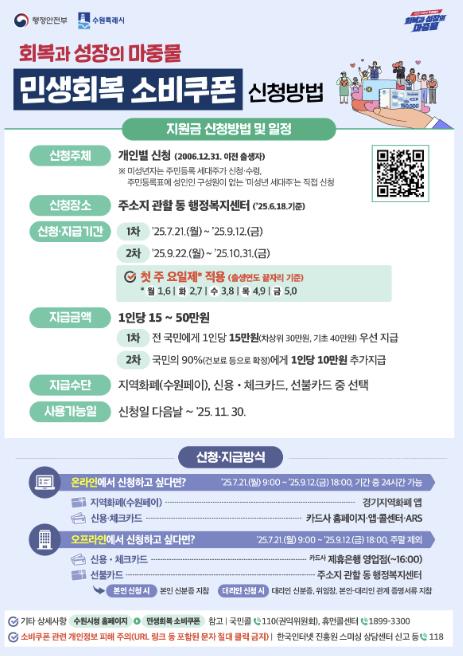 정부는 소비를 활성화하고, 소상공인·자영업자의 매출을 늘려 민생경제를 회복하기 위해 전 국민에게 민생회복 소비쿠폰 15~50만 원을 지급한다. 6월 18일 기준 주민등록상 주소지 관할 지자체에서 신청해야 한다.