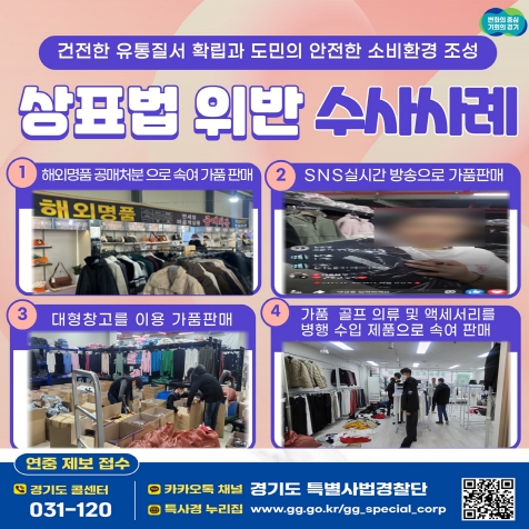 경기도 특별사법경찰단은 사회 전반에 광범위하게 퍼져 있는 짝퉁 제품 유통실태를 중대 범죄로 간주하고, 지난 1월부터 6월까지 소셜미디어 플랫폼인 인스타그램, 유튜브 라이브 방송 등을 집중 모니터링 했다. 이 과정에서 정품 브랜드의 상표를 무단 도용한 의류, 가방, 시계, 운동화 등 다양한 위조상품을 적발했다. 일부 상품은 소비자들이 진품으로 오해할 정도로 정교하게 제작돼 있어 소비자 피해가 상당한 것으로 나타났다.