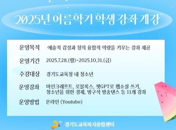 신청은 6월 30일 오전 10시부터 8월 29일 오후 5시까지 경기도교육복지종합센터 누리집에서' 회원가입 후 신청할 수 있으며 강좌 수 제한 없이 중복 신청도 가능하다.