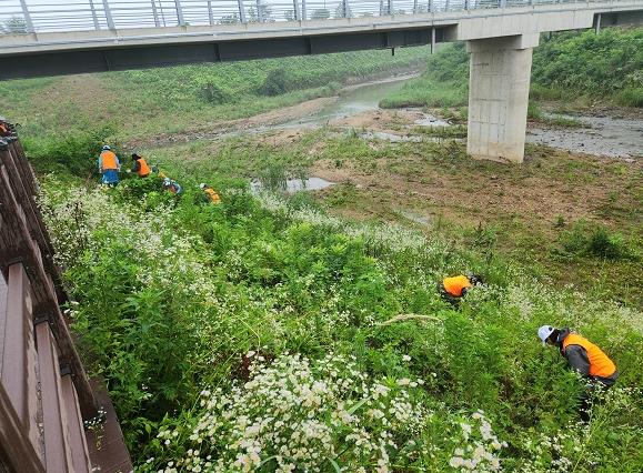 이날 활동은 원예봉사단체 '꽃으로' 회원 20명과 김경일 파주시장, 환경국장, 기후위기대응과장, 금촌1‧3동장 등 공무원 10여 명이 참여해 약 700미터 구간에 걸쳐 단풍잎돼지풀 등 생태계 교란종을 집중 제거했다.