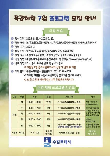 장안구 만석공원 내 수원시 목공 체험장에서 7월 한 달 동안 티슈함, 트리책꽂이, 원목트레이, 도마, 스탠드 등 실생활에 유용한 목공품을 만들어보는 체험 기회를 제공한다. 체험료는 1000~3000원(재료비 별도)이고, 초등학교 3학년 이상부터 참여할 수 있다.