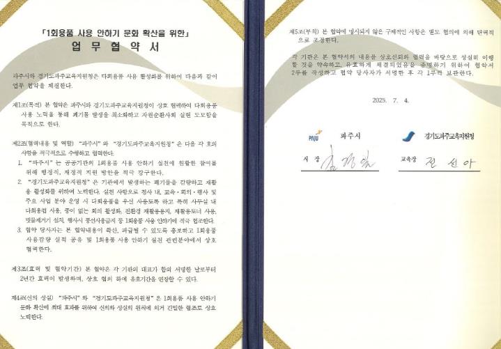 이 협약에 따라 파주시는 인근 공공기관들이 1회용품 사용 안하기에 동참할 수 있도록 행정적, 재정적 지원을 적극 협조하고, 참여 공공기관은 다회용품 사용 활성화에 앞장서는 동시에 1회용품 사용 감량 실적을 정기적으로 공유하기로 했다.