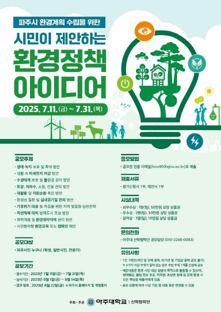 이번 공모전은 파주시민의 생활 속 환경문제 해결 아이디어를 폭넓게 수렴하고, 시민참여 기반의 환경정책 수립을 강화하기 위해 마련됐다. 접수 기간은 7월 11일부터 31일까지 총 20일간이며, 학생, 일반 시민, 전문가 등 파주시민이라면 누구나 자격 제한 없이 응모할 수 있다.