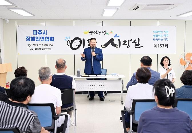 153번째를 맞이하는 이번 이동시장실은 파주시 장애인연합회와 관내 장애인단체 관계자, 장애인 등 20여 명이 참석해 장애인 단체의 원활한 운영과 복지 향상, 자립 지원을 위한 다양한 의견을 나눴다. 아울러 장애인회관 주차장 확충, 정보화 교육장과 문화활동 여건 개선, 장애인일자리사업 수행기관 확대 등 장애인이 지역사회에서 보다 안정적으로 생활할 수 있는 방안도 함께 논의했다.