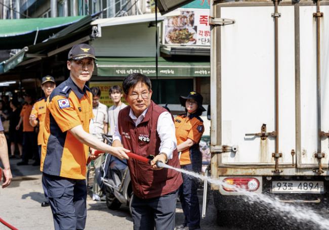 박강수 마포구청장은 지난 7월 25일 마포·공덕시장을 찾아 소방도로 확보 상황을 직접 확인하고, 시장 상인들과 함께 새로 설치된 비상소화장치의 사용법 교육에 참여하는 등 안전한 시장 환경 조성을 위한 현장 행정을 펼쳤다.