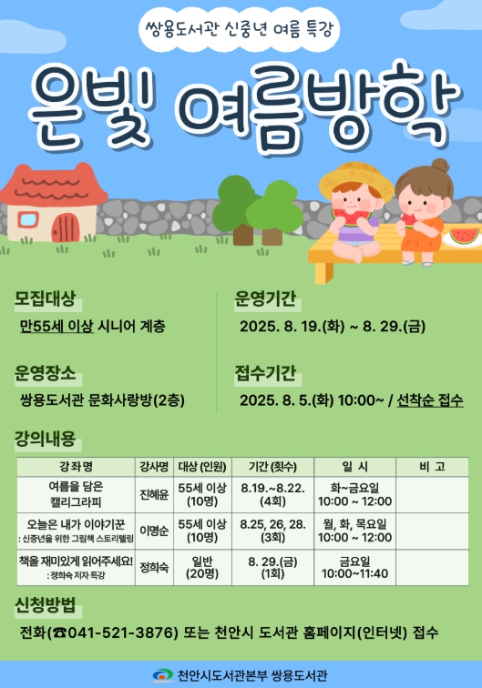 자세한 내용은 천안시도서관 누리집에서 확인할 수 있으며, 문의 사항은 쌍용도서관으로 하면 된다.