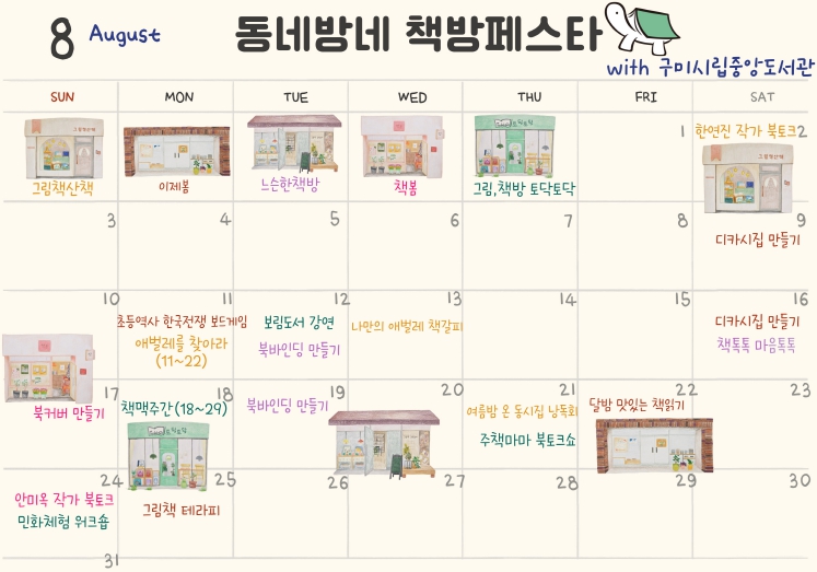 그림책산책에서는 '옥두두두두'그림책을 출간한 '한연진 작가 북토크', 여름밤 감성을 더할 '온 동시집 낭독회', 독서굿즈 '나만의 애벌레 책갈피 만들기', 책방 곳곳에 숨은 '책벌레를 찾아라' 이벤트를 진행한다.