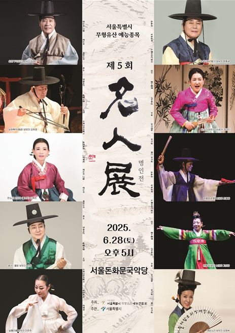 한편, 6월 28일 오후 5시에 열리는 '서울특별시무형유산 제4회 명인전'은 이달 공개행사의 백미다. 삼현육각, 판소리, 송서, 살풀이춤, 수표교 다리밟기, 한량무, 재담소리 등 다양한 장르의 예능 종목 보유자 10명이 한 무대에서 합동 공연을 펼친다.(전석 2만원)
