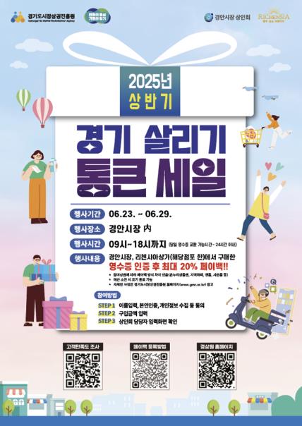 ‘통큰세일’은 경기도시장상권진흥원의 공모사업에 선정돼 추진되는 사업으로 경안시장‧리첸시아상가 연합(23일~29일), 신현 상인회(21일~29일), 광주시소상공인연합회(21일~26일) 등 총 3개 상권이 참여한다.