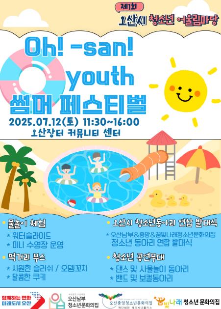 오산시 청소년 동아리 연합회 발대식과 함께 진행되는 본 축제에서는 ▲오산장터 커뮤니티센터 외부 광장에 설치되는 대형 워터 슬라이드 ▲청소년 동아리 공연 ▲다양한 먹거리 부스 등, 청소년은 물론 전 세대가 즐길 수 있는 다채로운 프로그램이 마련될 예정이다.