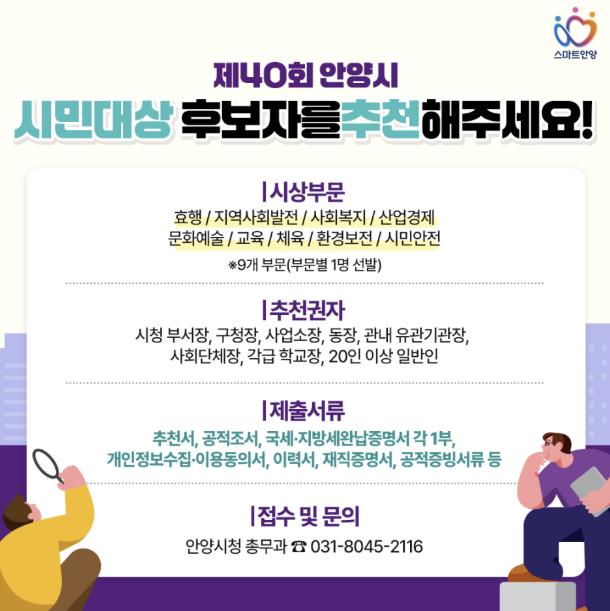 추천 대상은 2025년 7월 31일 기준 안양시에 3년 연속 거주하거나 근무하는 사람 중 시상 부문에 뚜렷한 공적이 있는 사람이다.