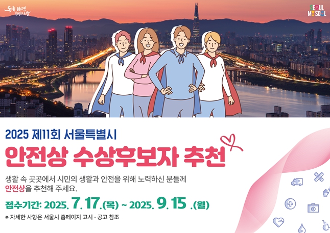 추천 대상은 재난의 예방, 복구, 기술 개발 등 다양한 분야에서 시민 안전에 기여한 개인 또는 단체다. 공고일 기준으로 서울시에 3년 이상 계속 거주하거나 사업장(직장)을 갖고 있어야 한다.