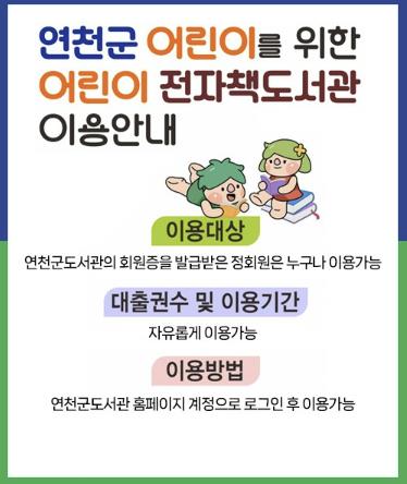 어린이 전자책도서관은 연천군도서관의 회원증을 발급받은 정회원이면 누구나 이용 가능하다.