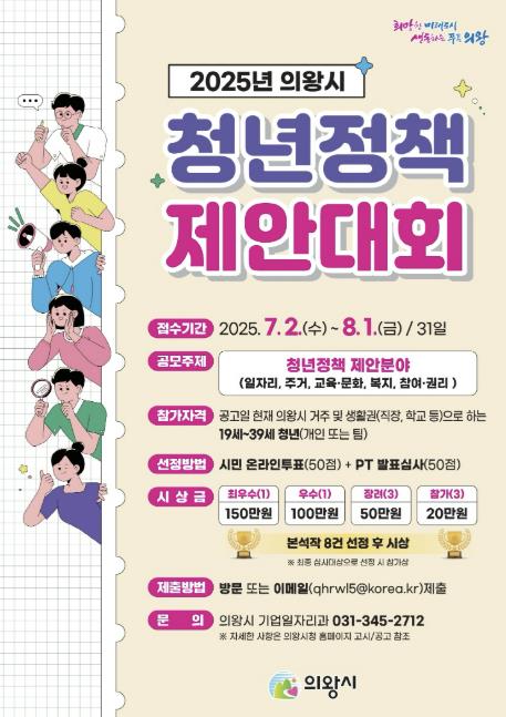 공모 주제는 청년들을 위한 정책이면 일자리, 주거, 교육, 복지, 문화정책 등 무엇이든 가능하다. 제안 신청 방법 등 대회에 관한 기타 자세한 사항은 의왕시 홈페이지 고시공고란을 확인하거나 의왕시청 기업일자리과 일자리청년팀으로 문의하면 안내받을 수 있다.