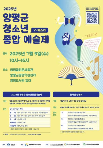 이번 예술제는 오는 7월 9일 오전 10시부터 오후 4시까지, 양평물맑은체육관, 양평군도서관, 양평군보건소 일대에서 개최된다. 음악, 무용, 문예, 사물놀이, 대중문화 등 5개 부문, 총 14개 종목의 경연이 펼쳐질 예정이며, 청소년뿐 아니라 지역 주민, 일반인 누구나 자유롭게 공연을 관람할 수 있다.