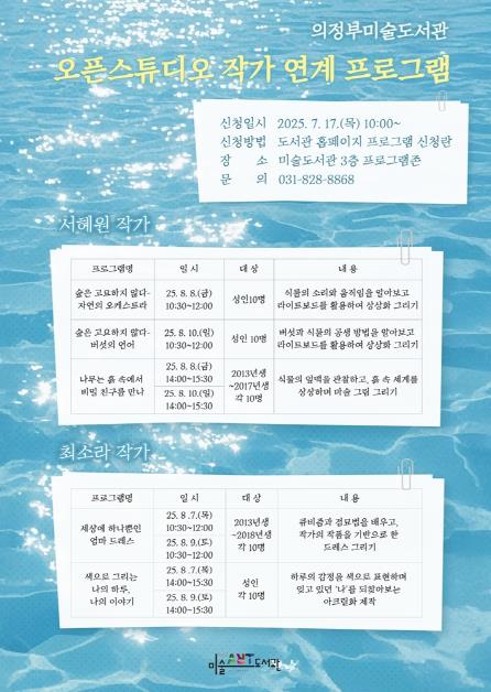 미술도서관은 2019년부터 작가 입주형 프로그램인 오픈스튜디오를 운영 중이며, 현재 10기 입주작가로 서혜원, 최소라 작가가 활동하고 있다. 이번 프로그램은 두 작가가 직접 기획한 수업으로, 시민들이 창작 과정에 참여하며 예술을 일상에서 경험할 수 있도록 구성됐다.