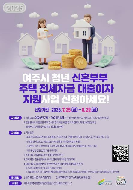 신청대상은 공고일(7/25) 1개월 이전 여주시에 주민등록을 둔 부부로서 혼인신고 후 10년 이내 무주택 신혼부부로부부 중 1명 이상이 18세 이상 ~ 39세 이하의 청년에 해당하여야 하며, 세대원 합산 연소득이 8천만원 이하, 전세가액 3억원 이하, 세대구성원 전원 무주택자로서 금융권(제1ܨ금융권)을 통해 주택 전세자금을 대출받은 경우 신청이 가능하다.