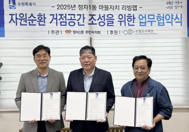 이번 협약은 정자1동 주민자치회가 수립한 ‘자원순환 거점공간 조성’ 사업이 수원도시재단의 ‘마을자치 리빙랩’ 공모사업에 선정됨에 따라 추진됐다. 해당 사업은 관내 생활쓰레기 무단투기 취약지역에 재활용 분리수거 공간인 ‘에코 스테이션’을 설치해 쾌적한 생활환경을 조성하는 것을 주요내용으로 한다.