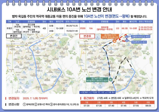 이에 부천시는 버스 노선의 안정적 운영을 위해 올해 시내버스 공공관리제 예산 약 62억 원을 편성했다. 7월 1일부터 10A번 버스 노선을 공공관리제로 전환하며 운행 대수를 4대에서 5대로 늘리고, 운행 횟수도 하루 56회에서 68.2회로 확대한다. 또한, 기존의 편도 운행 체계를 상시 왕복 운행 체계로 전환해 지역 주민들의 지하철역 접근성이 한층 더 개선될 전망이다.