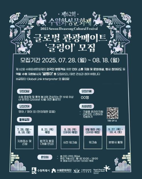 수원문화재단 관계자는 “글링이는 단순한 언어 지원을 넘어, 세계 각국에서 온 관람객과 수원시를 잇는 문화적 다리 역할을 하게 될 것”이라며 “열정과 언어 소양을 지닌 많은 이들의 참여를 기다린다”고 전했다.
