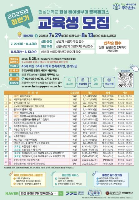 교육 장소는 협성대학교(화성시 봉담읍 최루백로 72)로, 강좌별 상세한 일정 및 모집인원 확인과 참여 신청은 화성 베이비부머 행복캠퍼스 홈페이지에서 할 수 있다.