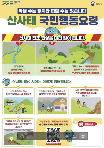 ‘산사태 국민행동요령’에는 산사태 전조현상을 사전에 파악하는 방법, 산사태 발생 시 안전하게 대피하는 행동 요령 등이 담겨 있어, 실제 위기 상황에서 큰 도움이 될 것으로 기대된다.