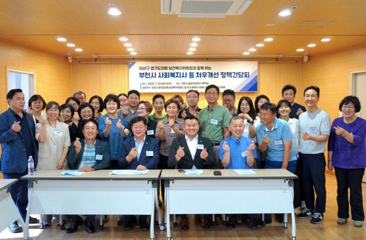 이날 정담회에는 박찬수 경기도사회복지사협회장, 박현 부천시사회복지사협회장을 비롯한 부천시 사회복지사 30여 명이 참석해 ▲사회복지사 처우개선비 인상 ▲장기근속휴가ㆍ자녀돌봄휴가ㆍ유급병가 등 복지제도 적용 대상 확대 ▲대체인력 지원체계 보완 ▲권역별 권익지원센터 설치 필요성 등에 대해 논의했다.