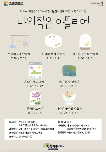 이번 프로그램은 교육 참여자가 ‘작가’로서 다양한 미술 재료를 경험하며 다채로운 활동을 진행한다. 참여 대상은 5세 이상의 어린이를 포함한 가족이며, 회차당 25명 이내로 매주 토요일(14~15시)에 진행된다. 교육 참가비는 무료이며, 여주세종문화관광재단 홈페이지를 통해 예약이 가능하다.