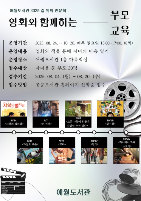 프로그램은 8월 24일부터 10월 26일까지 매주 일요일마다 총 8회차에 걸쳐 부모 30명을 대상으로 이뤄지며, 책과 영화를 통해 부모와 자녀의 감정과 관계를 깊이 있게 성찰하고 대화하는 시간이 될 것으로 기대된다.