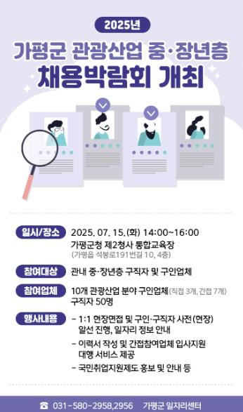 이날 오후 2시부터 4시까지 열리는 행사는 가평군과 가평군일자리센터가 함께 추진하는 ‘휴(休)일(work)은 가평’ 사업의 일환이다. 지역 내 관광서비스업 중심의 일자리 발굴을 통해 중장년 구직자와 기업 간 매칭을 유도하기 위한 것이다.