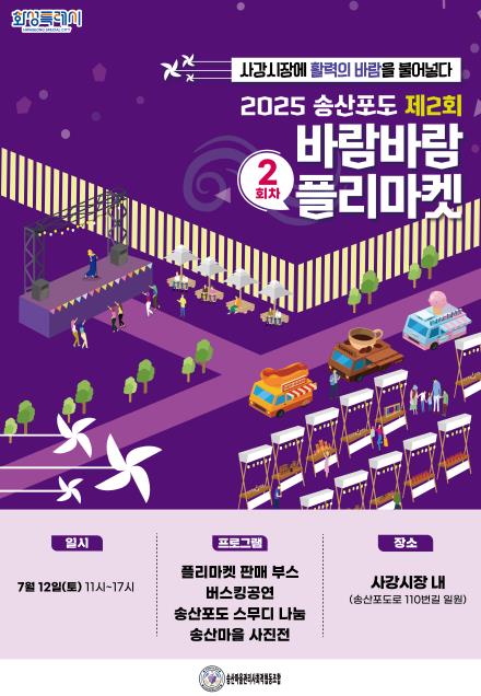 플리마켓은 사강시장 내 송산포도로 110번길 일원에서 오전 11시부터 오후 5시까지 운영되며, ▲플리마켓 판매 부스 ▲버스킹 공연 ▲송산포도 스무디 나눔 행사 ▲송산마을 사진전 등 다채로운 프로그램이 마련돼 있다.