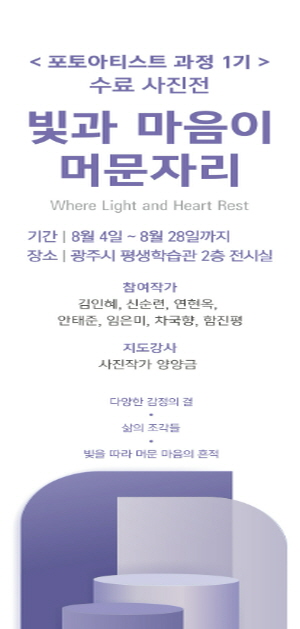 이번 전시는 지난 20주간의 학습 여정을 마무리하며 ‘빛과 마음이 머문 자리’라는 제목으로 7명의 수료생이 각자의 주제를 바탕으로 자신만의 시선과 이야기를 담아낸 작품 총 14점을 선보인다. 단순한 풍경 사진을 넘어 개인의 삶과 감정을 고스란히 담아낸 ‘마음의 기록’이자, 삶의 단편과 감정의 결, 그리고 빛을 따라 머문 마음의 흔적들이 작품 곳곳에 녹아 있다. 전시는 8월 4일부터 28일까지 광주시 평생학습관 2층 전시실에서 진행된다.