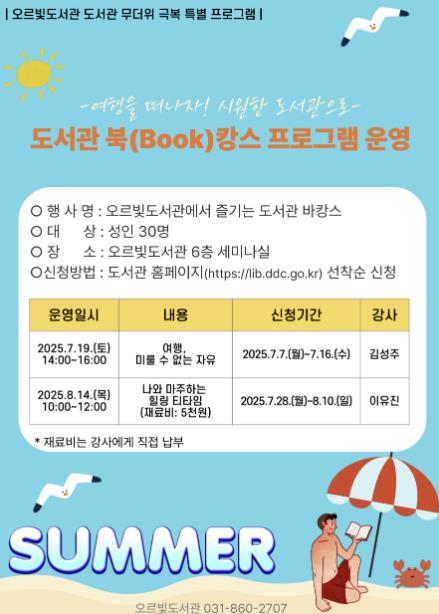 도서관 관계자는 “더위를 피해 도서관에서 책과 함께하는 ‘북캉스’로 시민들이 편안하고 뜻깊은 여름을 보내길 바란다”라며 “앞으로도 주민의 일상에 쉼과 배움을 더하는 프로그램을 지속 운영하겠다”라고 말했다.
