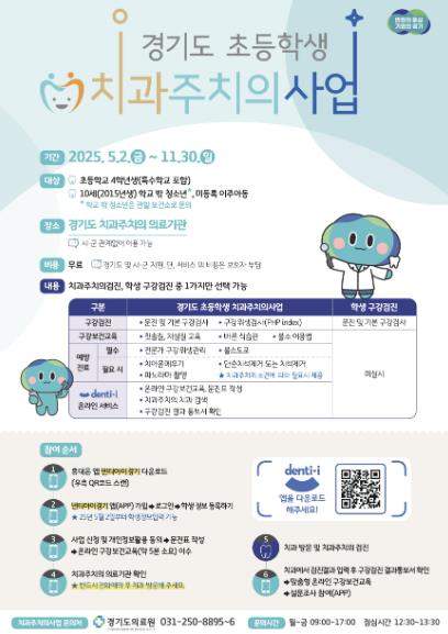 경기도 초등학생 치과주치의사업은 영구치 배열이 완성되고 구강건강관리 효과가 높은 초등학교 4학년생 및 동연령 아동(학교 밖 청소년 및 미등록 이주 아동 등)을 대상으로 지정 치과 의료기관 방문 시 ▲구강검진 ▲구강보건교육(칫솔질 및 바른식습관 등) ▲불소도포 ▲치아홈메우기 ▲치석제거 ▲파노라마 촬영 등 1인당 4만8천원 상당의 포괄적 구강예방 서비스를 무료로 지원 받을 수 있다.