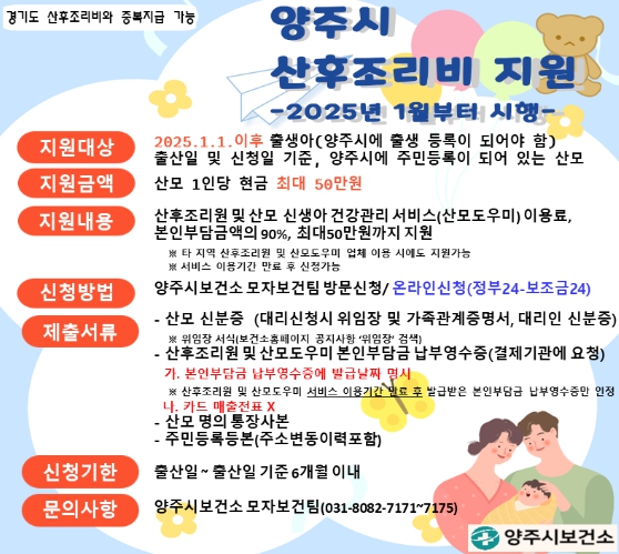 양주시 관계자는 “출산 후 회복은 곧 산모의 삶과 아기의 건강한 시작을 위한 가장 기본적인 배려이므로, 모든 가정이 경제적 부담없이 충분한 돌봄을 누릴 수 있도록 세심히 살피겠다”고 전했다.